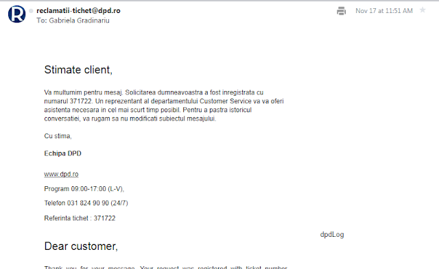Sa incep cu inceputul. Trebuia sa primesc un colet trimis prin DPD. Am primit  AWB-ul coletului si anume 80000889504, pentru a putea urmari coletul. In dimineata cand trebuia sa primesc acel colet am incerat sa sun la DPD. In acea dimineata ma trezisem tarziu, in jur de ora 11:00 si mi-a fost mai usor sa sun. Am nimerit peste un robot, apasa tasta 1 pentru…, apasa tasta 2 pentru… si tot asa. Intr-un final, dupa ce am incercat de 3 ori sa sun, a reusit sa ma preia o doamna/domnisoara. I-am spus AWB-ul si mi-a zis ca acel colet este deja predat. PREDAT CUI? Eu nu il primisem, nu semnasem pentru el. A zis sa fac o sesizare pe mail, alta varianta nu am.